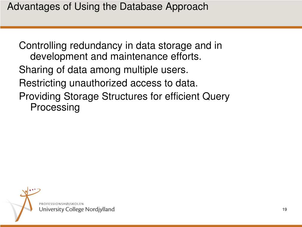 Advantages of Using the Database Approach • Controlling redundancy in data storage and in development and maintenance efforts. • Sharing of data among multiple users. • Restricting unauthorized access to data. • Providing Storage Structures for efficient Query Processing