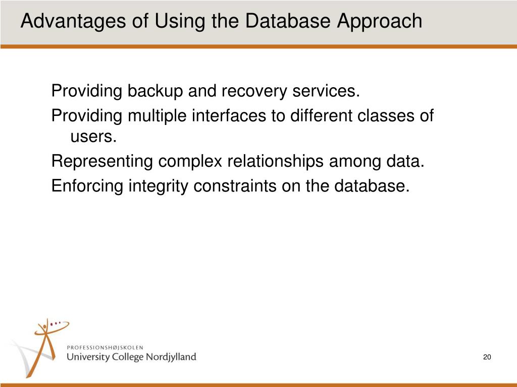 Advantages of Using the Database Approach • Providing backup and recovery services. • Providing multiple interfaces to different classes of users. • Representing complex relationships among data. • Enforcing integrity constraints on the database.