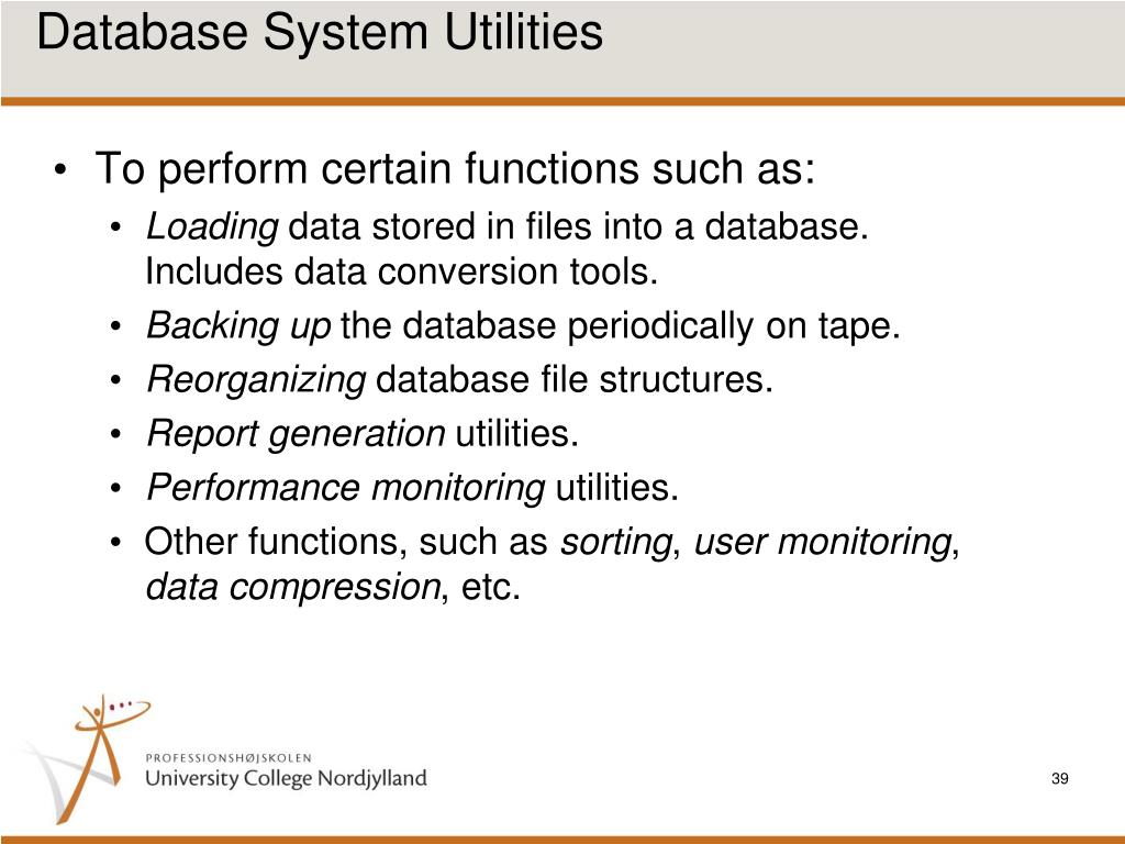 Database System Utilities • To perform certain functions such as: • Loading data stored in files into a database. Includes data conversion tools. • Backing up the database periodically on tape. • Reorganizing database file structures. • Report generation utilities. • Performance monitoring utilities. • Other functions, such as sorting, user monitoring, data compression, etc.