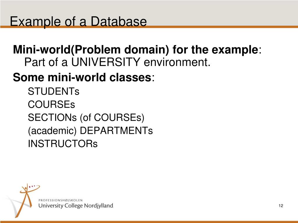 Example of a Database • Mini-world(Problem domain) for the example: Part of a UNIVERSITY environment. • Some mini-world classes: • STUDENTs • COURSEs • SECTIONs (of COURSEs) • (academic) DEPARTMENTs • INSTRUCTORs