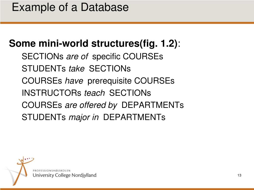 Example of a Database • Some mini-world structures(fig. 1.2): • SECTIONs are of specific COURSEs • STUDENTs take SECTIONs • COURSEs have prerequisite COURSEs • INSTRUCTORs teach SECTIONs • COURSEs are offered by DEPARTMENTs • STUDENTs major in DEPARTMENTs