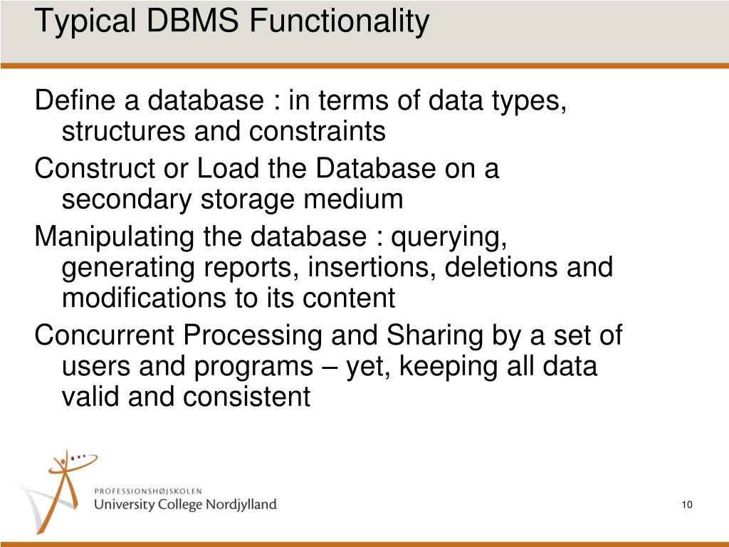 Typical DBMS Functionality • Define a database : in terms of data types, structures and constraints • Construct or Load the Database on a secondary storage medium • Manipulating the database : querying, generating reports, insertions, deletions and modifications to its content • Concurrent Processing and Sharing by a set of users and programs – yet, keeping all data valid and consistent