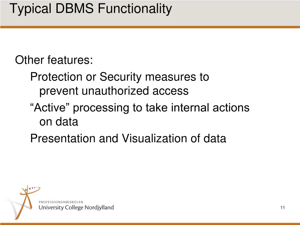 Typical DBMS Functionality Other features: • Protection or Security measures to prevent unauthorized access • “Active” processing to take internal actions on data • Presentation and Visualization of data