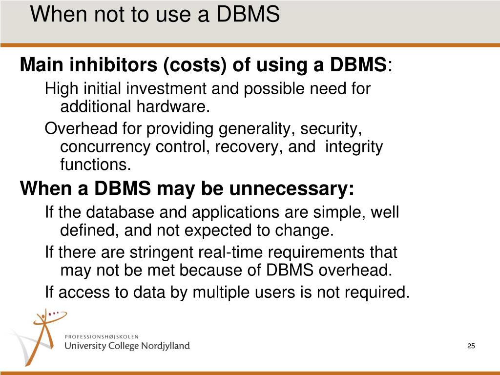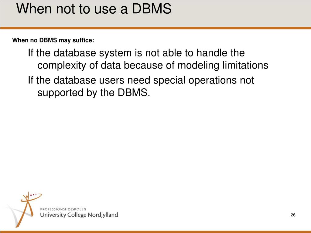 When not to use a DBMS • When no DBMS may suffice: • If the database system is not able to handle the complexity of data because of modeling limitations • If the database users need special operations not supported by the DBMS.