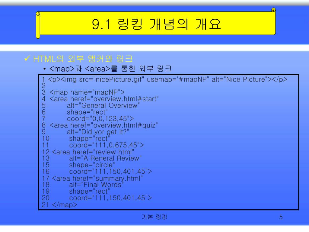 9.1 링킹 개념의 개요 • HTML의 외부 앵커와 링크 • <map>과 <area>를 통한 외부 링크 기본 링킹
