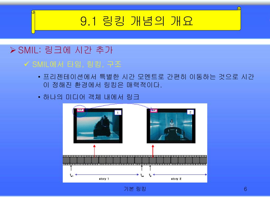 9.1 링킹 개념의 개요 • SMIL: 링크에 시간 추가 • SMIL에서 타임, 링킹, 구조 • 프리젠테이션에서 특별한 시간 모멘트로 간편히 이동하는 것으로 시간이 정해진 환경에서 링킹은 매력적이다. • 하나의 미디어 객체 내에서 링크 기본 링킹