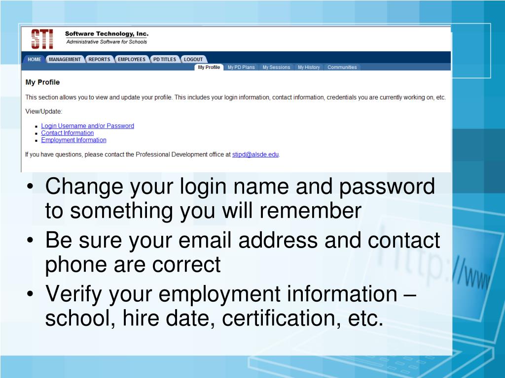 Change your login name and password to something you will remember • Be sure your email address and contact phone are correct • Verify your employment information – school, hire date, certification, etc.