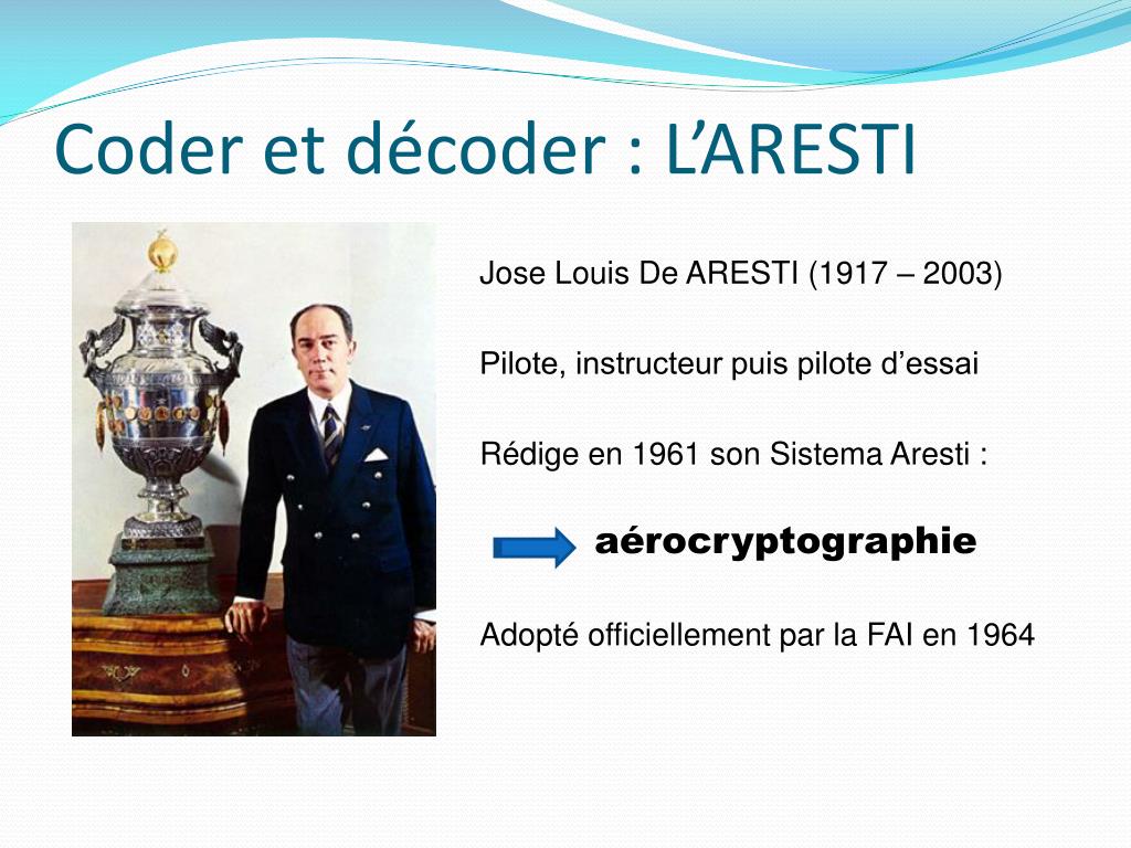 Coder et décoder : L’ARESTI Jose Louis De ARESTI (1917 – 2003) • Pilote, instructeur puis pilote d’essai • Rédige en 1961 son SistemaAresti : • Adopté officiellement par la FAI en 1964 aérocryptographie