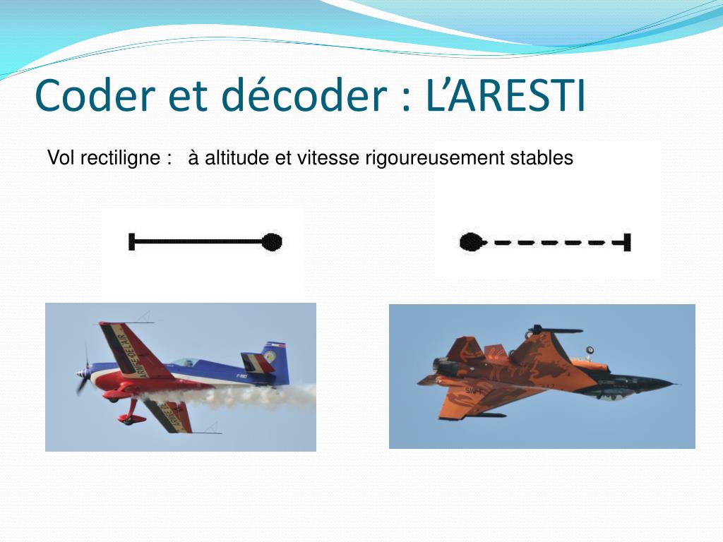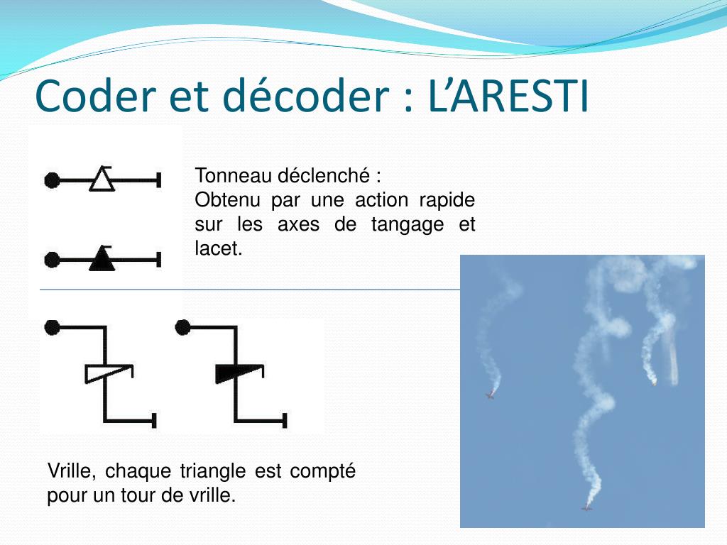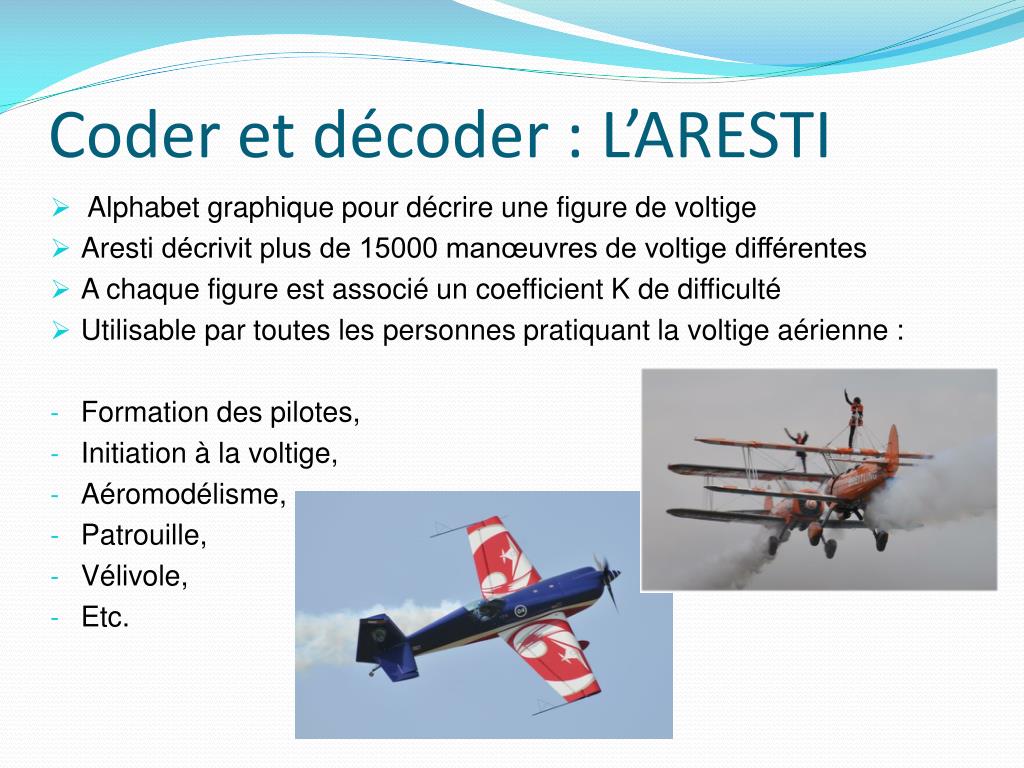 Coder et décoder : L’ARESTI • Alphabet graphique pour décrire une figure de voltige • Aresti décrivit plus de 15000 manœuvres de voltige différentes • A chaque figure est associé un coefficient K de difficulté • Utilisable par toutes les personnes pratiquant la voltige aérienne : • Formation des pilotes, • Initiation à la voltige, • Aéromodélisme, • Patrouille, • Vélivole, • Etc.