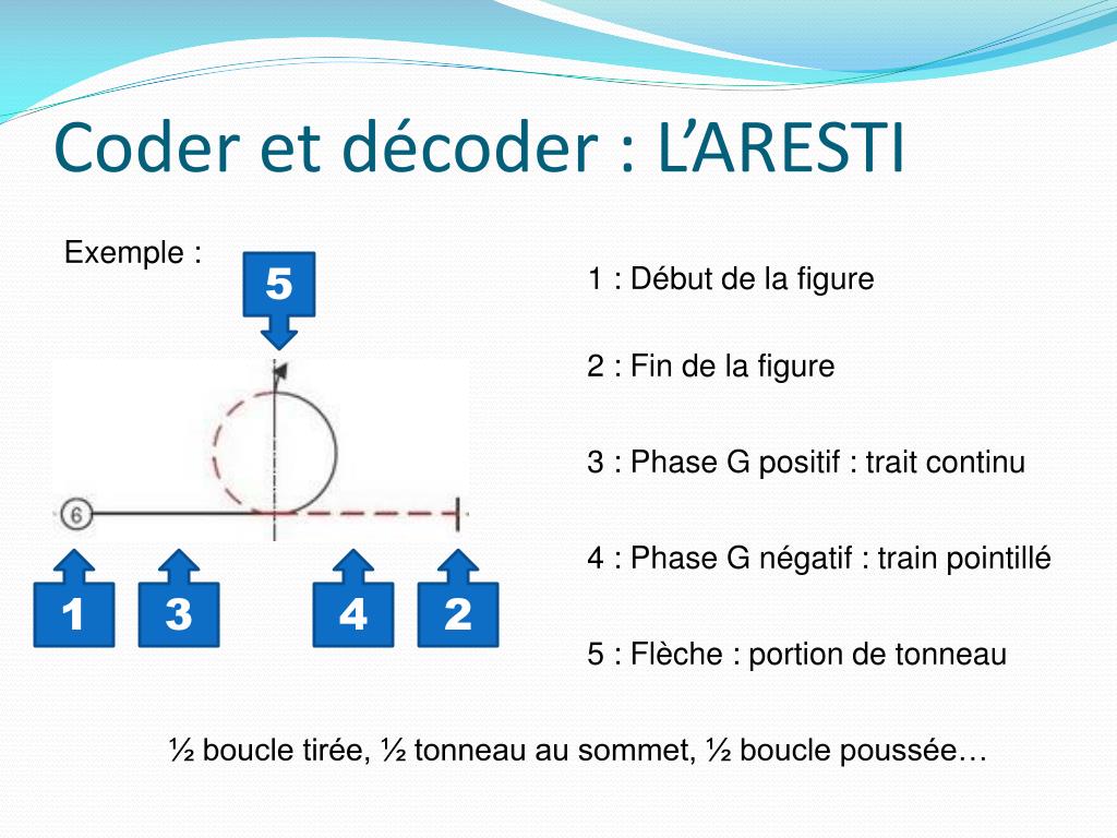 Coder et décoder : L’ARESTI Exemple : 5 • 1 : Début de la figure • 2 : Fin de la figure • 3 : Phase G positif : trait continu • 4 : Phase G négatif : train pointillé 1 3 4 2 • 5 : Flèche : portion de tonneau ½ boucle tirée, ½ tonneau au sommet, ½ boucle poussée…