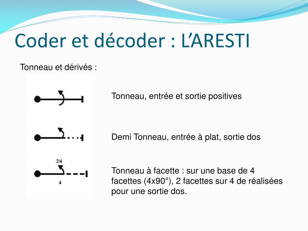 Coder et décoder : L’ARESTI Tonneau et dérivés : Tonneau, entrée et sortie positives Demi Tonneau, entrée à plat, sortie dos Tonneau à facette : sur une base de 4 facettes (4x90°), 2 facettes sur 4 de réalisées pour une sortie dos.