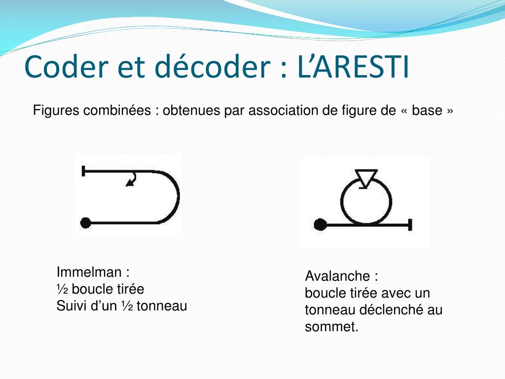 Coder et décoder : L’ARESTI Figures combinées : obtenues par association de figure de « base » Immelman : ½ boucle tirée Suivi d’un ½ tonneau Avalanche : boucle tirée avec un tonneau déclenché au sommet.