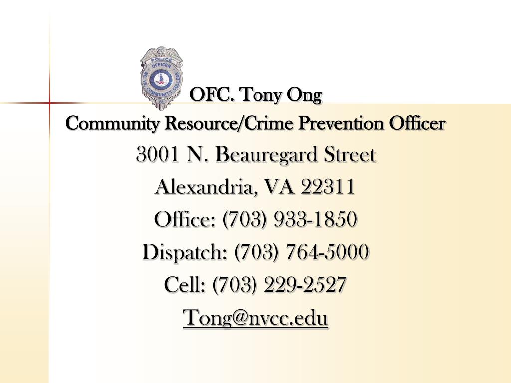 OFC. Tony Ong Community Resource/Crime Prevention Officer 3001 N. Beauregard Street Alexandria, VA 22311 Office: (703) 933-1850 Dispatch: (703) 764-5000 Cell: (703) 229-2527 Tong@nvcc.edu