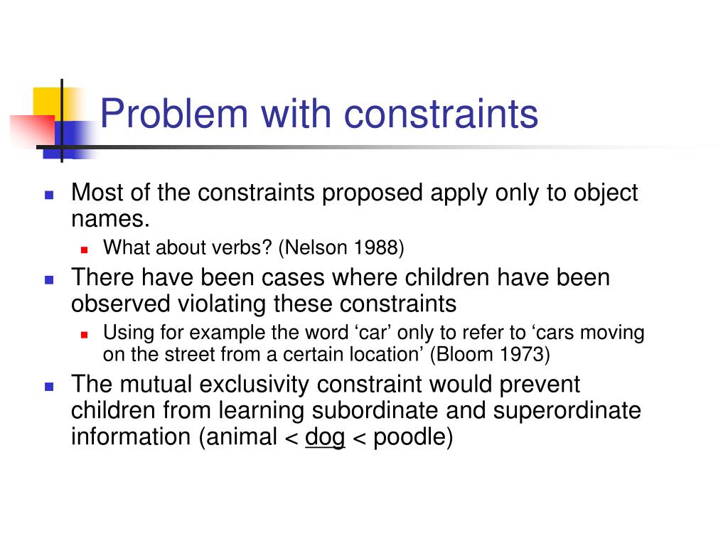 Problem with constraints • Most of the constraints proposed apply only to object names. • What about verbs? (Nelson 1988) • There have been cases where children have been observed violating these constraints • Using for example the word ‘car’ only to refer to ‘cars moving on the street from a certain location’ (Bloom 1973) • The mutual exclusivity constraint would prevent children from learning subordinate and superordinate information (animal < dog < poodle)