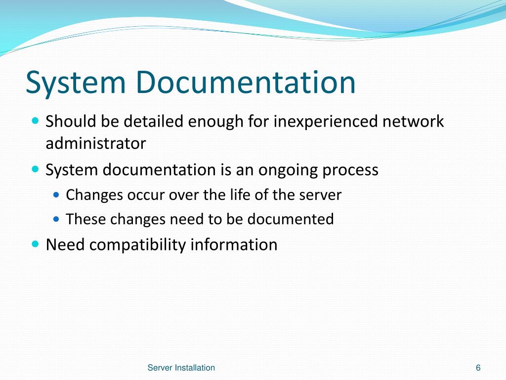 System Documentation • Should be detailed enough for inexperienced network administrator • System documentation is an ongoing process • Changes occur over the life of the server • These changes need to be documented • Need compatibility information Server Installation