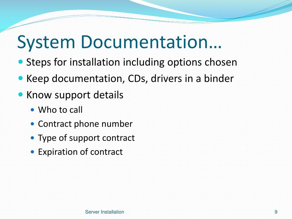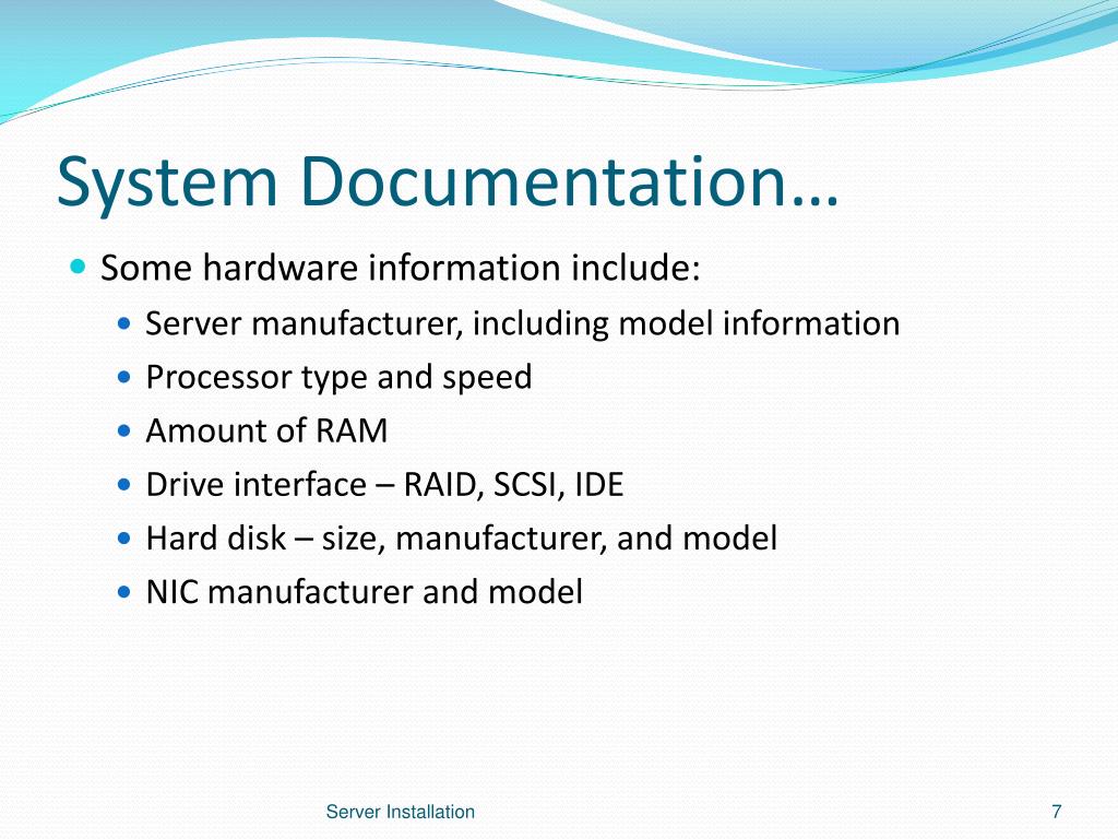 System Documentation… • Some hardware information include: • Server manufacturer, including model information • Processor type and speed • Amount of RAM • Drive interface – RAID, SCSI, IDE • Hard disk – size, manufacturer, and model • NIC manufacturer and model Server Installation