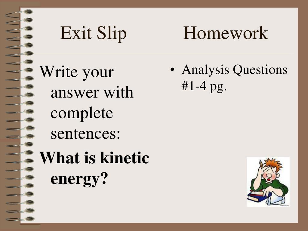 Write your answer with complete sentences: What is kinetic energy? Analysis Questions #1-4 pg. Exit Slip Homework