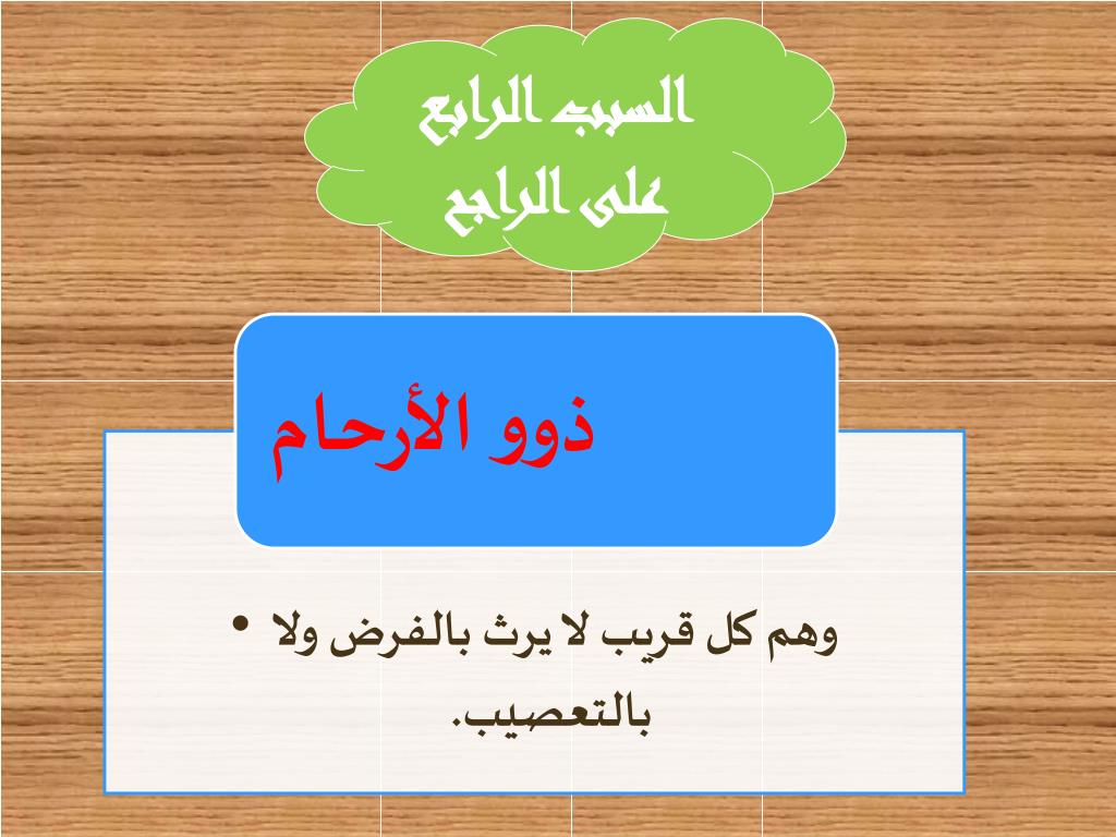 1-الأب(أب) 2-الجد(جد)وإن علا أجانب 14-الزوج(ج) 15-المعتق(معتق) الوارثون من الرجال الأصول 10-العم الشقيق (عم ق). 11-العم لأب(عم ب). 12-ابن العم الشقيق (بن عم ق). 13-ابن العم لأب (بن عم ب). 5-الأخ الشقيق (ق). 6-الأخ من الأب(خب). 7-الأخ من الأم (خم). 8-ابن الأخ الشقيق (بن ق). 9-ابن الأخ لأب(بنخب). الفروع 3-الابن(بن) 4-ابن الابن(بن بن) وإن نزل