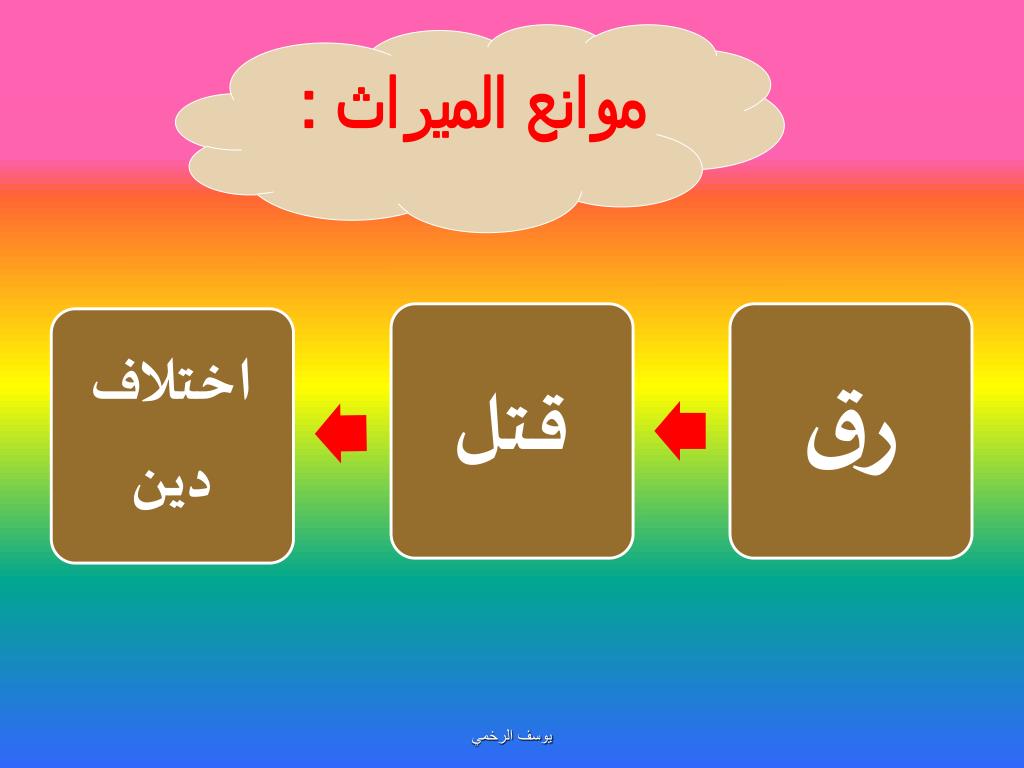 يتعلق بتركة الميت خمسة حقوق مرتبة : • 1-الزكــــــــــاة. • 2-مؤن التجهيز. • 3-الديـــــــــون. • 4-الوصية بالثلث فأقل. • 5-الإرث. يوسف الرخمي