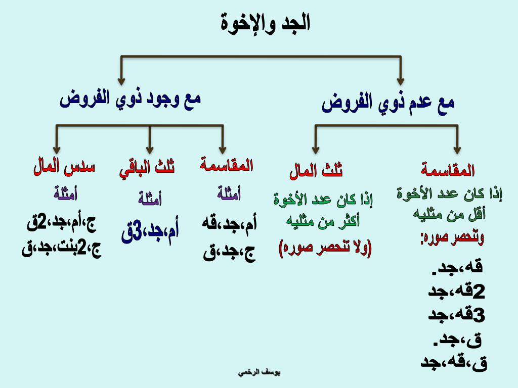 الجد والإخوة مع وجود ذوي الفروض مع عدم ذوي الفروض سدسالمال المقاسمة ثلث الباقي ثلث المال المقاسمة أمثلة أمثلة إذا كان عدد الأخوة أقل من مثليه أمثلة إذا كان عدد الأخوة أكثر من مثليه ج،أم،جد،2ق ج،2بنت،جد،ق أم،جد،قه ج،جد،ق أم،جد،3ق وتنحصر صوره: (ولا تنحصر صوره) قه،جد. 2قه،جد 3قه،جد ق،جد. ق،قه،جد يوسف الرخمي