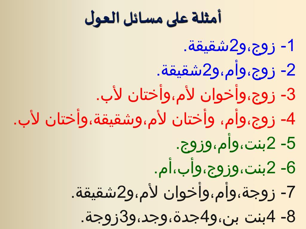 أمثلة على مسائل العول 1- زوج،و2شقيقة. 2- زوج،وأم،و2شقيقة. 3- زوج،وأخوان لأم،وأختان لأب. 4- زوج،وأم، وأختان لأم،وشقيقة،وأختان لأب. 5- 2بنت،وأم،وزوج. 6- 2بنت،وزوج،وأب،أم. 7- زوجة،وأم،وأخوان لأم،و2شقيقة. 8- 4بنت بن،و4جدة،وجد،و3زوجة.