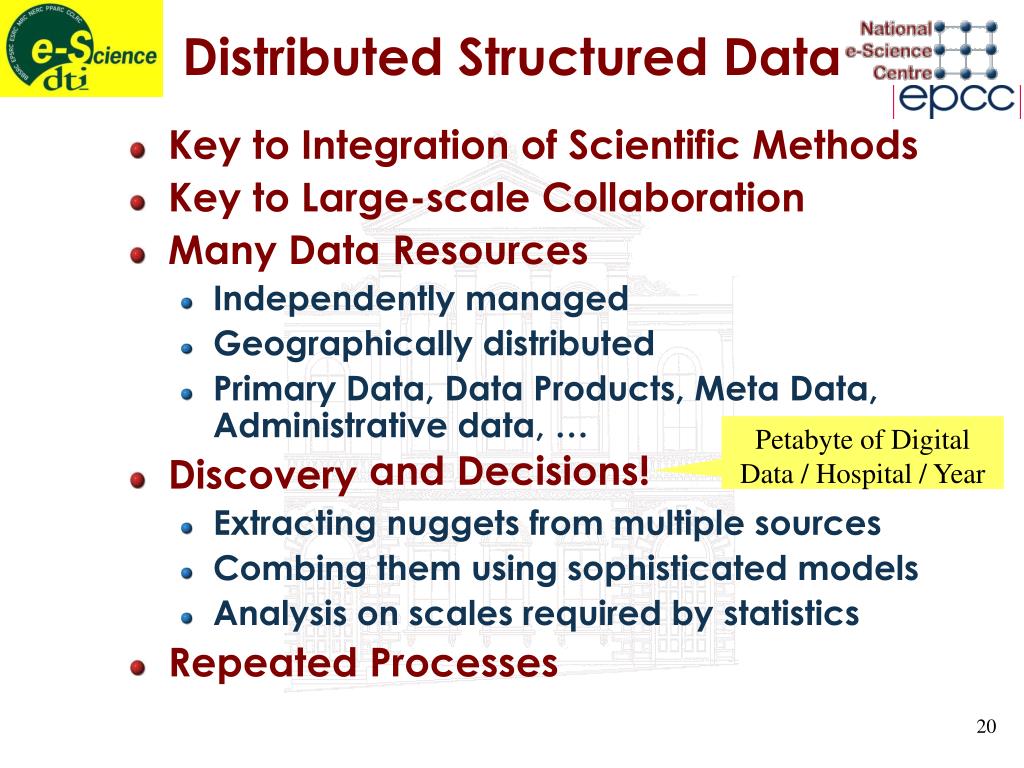 Distributed Structured Data • Key to Integration of Scientific Methods • Key to Large-scale Collaboration • Many Data Resources • Independently managed • Geographically distributed • Primary Data, Data Products, Meta Data, Administrative data, … • Discovery • Extracting nuggets from multiple sources • Combing them using sophisticated models • Analysis on scales required by statistics • Repeated Processes Petabyte of Digital Data / Hospital / Year and Decisions!