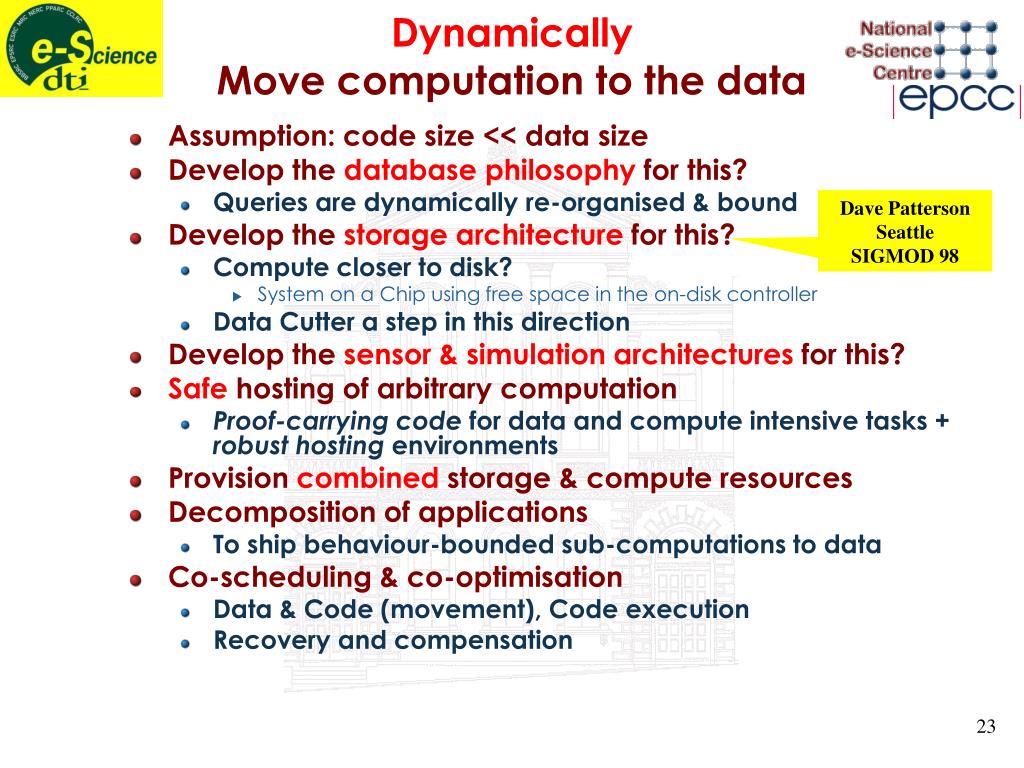 DynamicallyMove computation to the data • Assumption: code size << data size • Develop the database philosophy for this? • Queries are dynamically re-organised & bound • Develop the storage architecture for this? • Compute closer to disk? • System on a Chip using free space in the on-disk controller • Data Cutter a step in this direction • Develop the sensor & simulation architectures for this? • Safe hosting of arbitrary computation • Proof-carrying code for data and compute intensive tasks + robust hosting environments • Provision combined storage & compute resources • Decomposition of applications • To ship behaviour-bounded sub-computations to data • Co-scheduling & co-optimisation • Data & Code (movement), Code execution • Recovery and compensation Dave Patterson Seattle SIGMOD 98