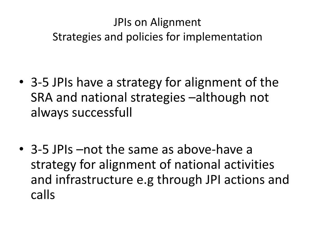 JPIsonAlignmentStrategies and policies for implementation • 3-5 JPIs have a strategy for alignment of the SRA and national strategies –although not alwayssuccessfull • 3-5 JPIs –not the same as above-have a strategy for alignment of national activities and infrastructuree.gthrough JPI actions and calls