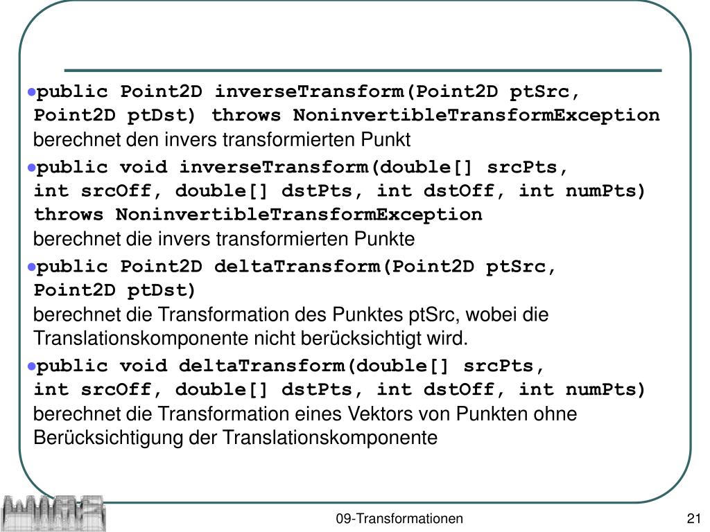 public Point2D inverseTransform(Point2D ptSrc, Point2D ptDst) throws NoninvertibleTransformExceptionberechnet den invers transformierten Punkt • public void inverseTransform(double[] srcPts, int srcOff, double[] dstPts, int dstOff, int numPts) throws NoninvertibleTransformExceptionberechnet die invers transformierten Punkte • public Point2D deltaTransform(Point2D ptSrc, Point2D ptDst)berechnet die Transformation des Punktes ptSrc, wobei die Translationskomponente nicht berücksichtigt wird. • public void deltaTransform(double[] srcPts, int srcOff, double[] dstPts, int dstOff, int numPts)berechnet die Transformation eines Vektors von Punkten ohne Berücksichtigung der Translationskomponente 09-Transformationen