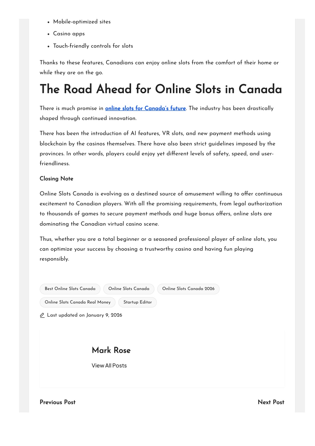 Mobile-optimized sites Casino apps Touch-friendly controls for slots Thanks to these features, Canadians can enjoy online slots from the comfort of their home or while they are on the go. The Road Ahead for Online Slots in Canada There is much promise in online slots for Canada’s future. The industry has been drastically shaped through continued innovation. There has been the introduction of AI features, VR slots, and new payment methods using blockchain by the casinos themselves. There have also been strict guidelines imposed by the provinces. In other words, players could enjoy yet di?erent levels of safety, speed, and user- friendliness. Closing Note Online Slots Canada is evolving as a destined source of amusement willing to o?er continuous excitement to Canadian players. With all the promising requirements, from legal authorization to thousands of games to secure payment methods and huge bonus o?ers, online slots are dominating the Canadian virtual casino scene. Thus, whether you are a total beginner or a seasoned professional player of online slots, you can optimize your success by choosing a trustworthy casino and having fun playing responsibly. Best Online Slots Canada Online Slots Canada Online Slots Canada 2026 Online Slots Canada Real Money Startup Editor Last updated on January 9, 2026 Mark Rose View All Posts Previous Post Next Post