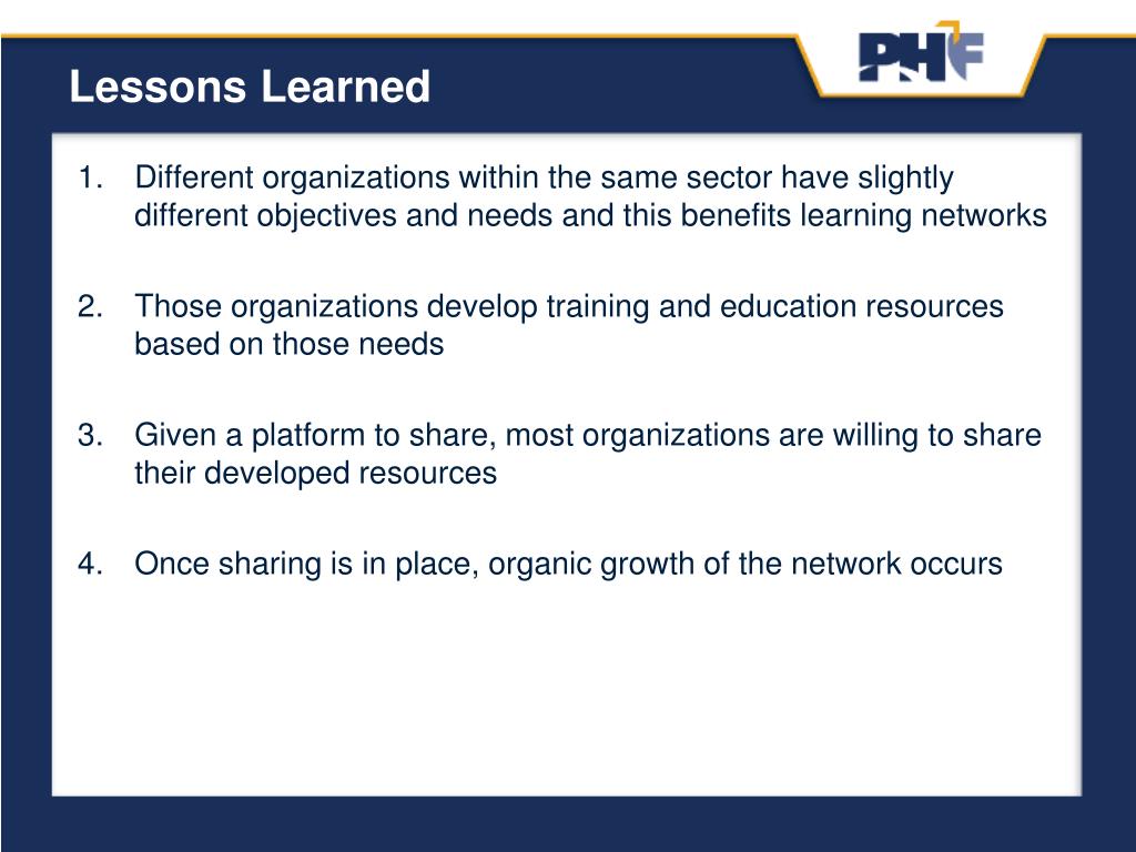 Lessons Learned • Different organizations within the same sector have slightly different objectives and needs and this benefits learning networks • Those organizations develop training and education resources based on those needs • Given a platform to share, most organizations are willing to share their developed resources • Once sharing is in place, organic growth of the network occurs