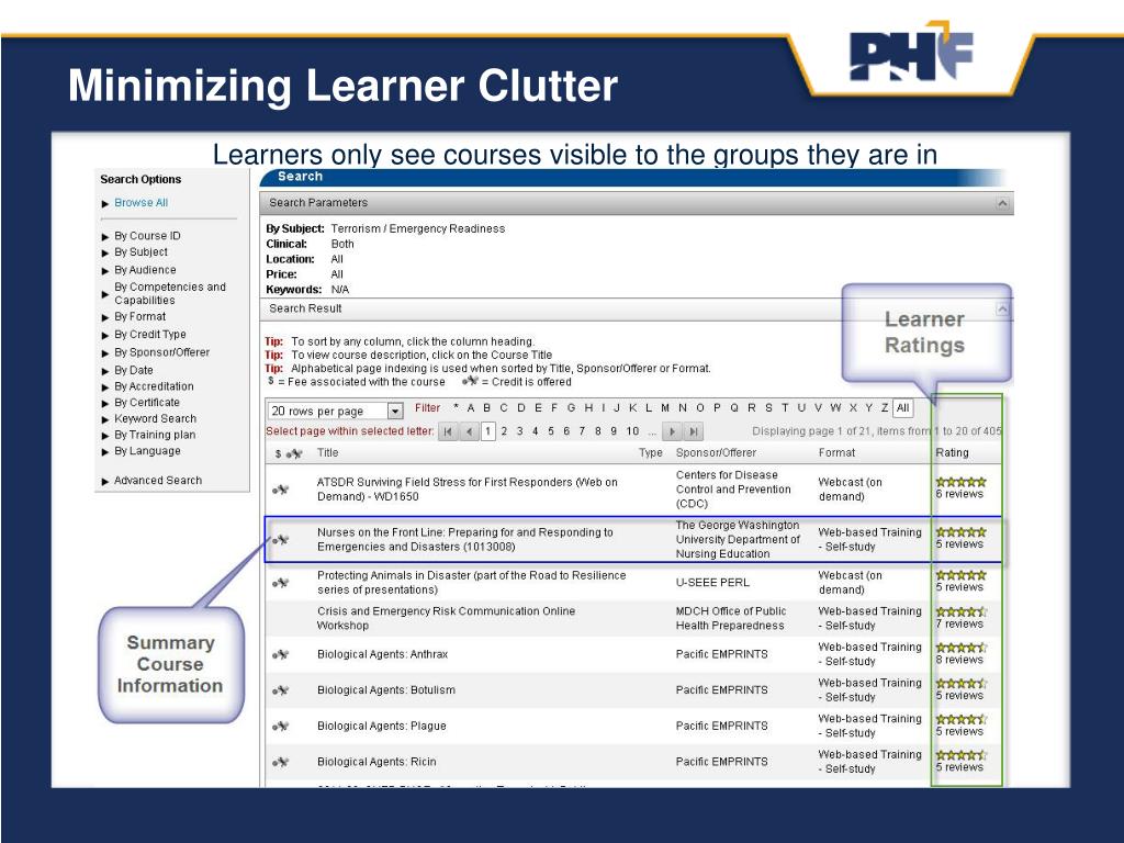 Benefits to the Learner • Locate courses, conferences, and trainings geared towards your profession • Find up-to-date courses on a spectrum of public health issues: • Health Communications • Terrorism / Emergency Readiness • Minority Health / Health Disparities • Infectious Diseases / Immunizations • Obesity • Meet your continuing education requirements: • CNE, CME, CEU/CE, CHES, CEC-Dental • MTASCP • Academic Credit • and more!
