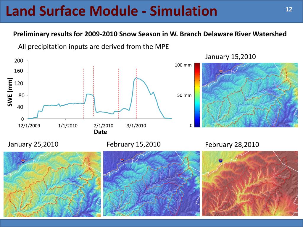 Land Surface Module - Simulation 12 Preliminary results for 2009-2010 Snow Season in W. Branch Delaware River Watershed All precipitation inputs are derived from the MPE SWE (mm) 200 January 15,2010 160 100 mm 120 80 50 mm 40 0 12/1/2009 1/1/2010 2/1/2010 3/1/2010 4/1/2010 Date 0 January 25,2010 February 15,2010 February 28,2010