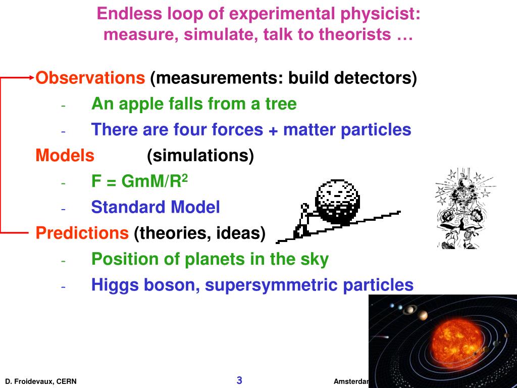 Observations (measurements: build detectors) An applefallsfrom a tree There are four forces + matterparticles Models(simulations) F = GmM/R2 Standard Model Predictions(theories, ideas) Position of planets in the sky Higgs boson, supersymmetricparticles Endless loop of experimental physicist: measure, simulate, talk to theorists …