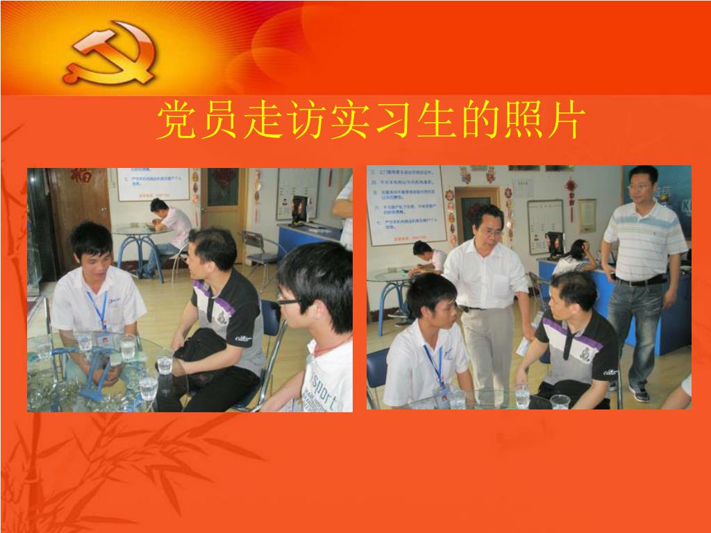 走访企业实习的学生 随后,参加党日活动的党员同志还走访正在该公司实习的学生,并与他们亲切交谈合影。其中,08级房地产经营与估价1班的黄钰绵同学从2010年6月在该公司实习,目前该生做到实习店长岗位,负责店面的所有事务,工作能力得到公司的认可。