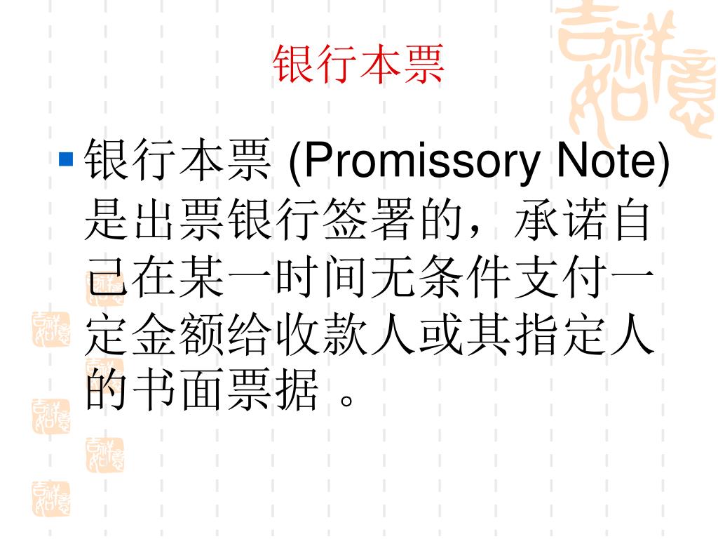 银行本票 • 银行本票 (Promissory Note)是出票银行签署的,承诺自己在某一时间无条件支付一定金额给收款人或其指定人的书面票据 。