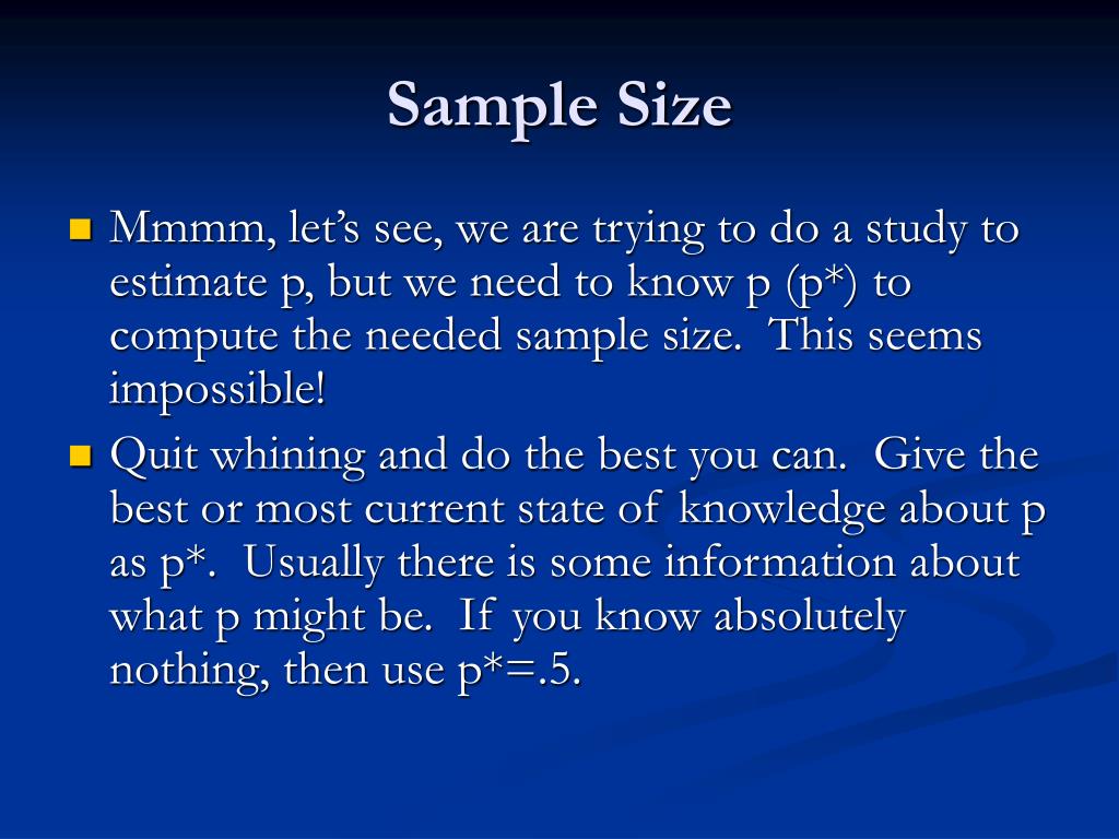 Sample Size • Mmmm, let’s see, we are trying to do a study to estimate p, but we need to know p (p*) to compute the needed sample size. This seems impossible! • Quit whining and do the best you can. Give the best or most current state of knowledge about p as p*. Usually there is some information about what p might be. If you know absolutely nothing, then use p*=.5.
