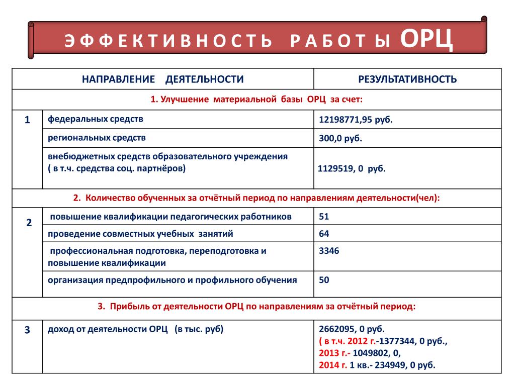 ОСНОВНЫЕ НАПРАВЛЕНИЯ ДЕЯТЕЛЬНОСТИ ОРЦ Общеобразовательные школы Образовательные организации СПО и ВПО Предприятия • - организация непрерывного • предпрофильного и профильного • обучения • - организация элективных курсов; • организация профессиональной • подготовки; • - профориентационная работа; • проведение совместных учебных • занятий; • обмен опытом; • - проведение мастер-классов, • научно-практических конференций; • - проведение обучающих семинаров; • - курсовое повышение квалификации; • - проведение обучающих вебинаров; - профессиональная подготовка, переподготовка и повышение квалификации; - экспертиза УПД; - модернизация материально- технической базы; - стажировка мастеров п/о и преподавателей профессиональных дисциплин,