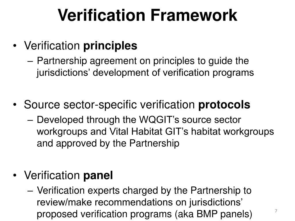 Verification Framework • Verification principles • Partnership agreement on principles to guide the jurisdictions’ development of verification programs • Source sector-specific verification protocols • Developed through the WQGIT’s source sector workgroups and Vital Habitat GIT’s habitat workgroups and approved by the Partnership • Verification panel • Verification experts charged by the Partnership to review/make recommendations on jurisdictions’ proposed verification programs (aka BMP panels)