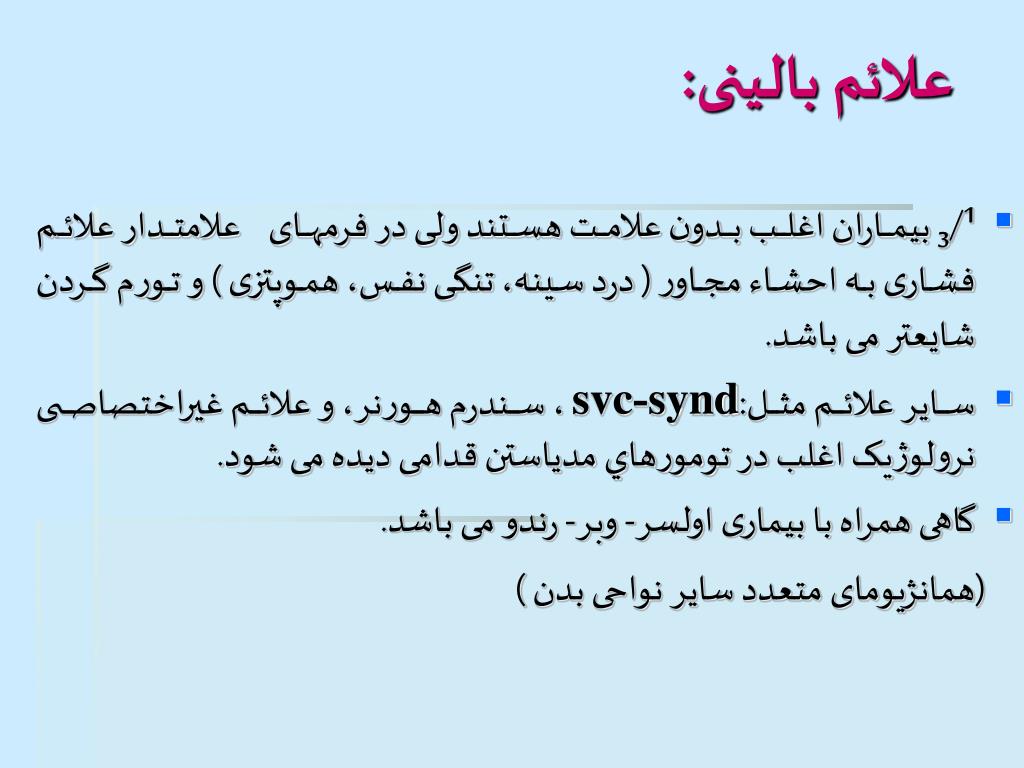 علائم بالینی: • 3/1 بیماران اغلب بدون علامت هستند ولی در فرمهای علامتدار علائم فشاری به احشاء مجاور ( درد سینه، تنگی نفس، هموپتزی ) و تورم گردن شایعتر می باشد. • سایر علائم مثل:synd-svc ، سندرم هورنر، و علائم غیراختصاصی نرولوژیک اغلب در تومورهاي مدیاستن قدامی دیده می شود. • گاهی همراه با بیماری اولسر- وبر- رندو می باشد. (همانژیومای متعدد سایر نواحی بدن )