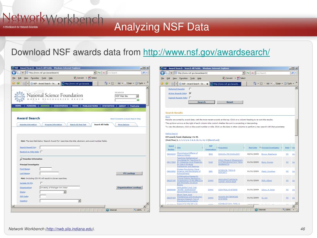 Analyzing NSF Data Download NSF awards data from http://www.nsf.gov/awardsearch/ Network Workbench (http://nwb.slis.indiana.edu). 46