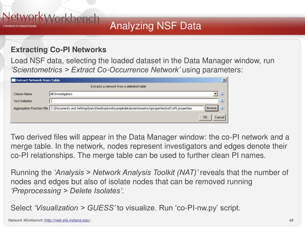 Analyzing NSF Data Extracting Co-PI Networks Load NSF data, selecting the loaded dataset in the Data Manager window, run ‘Scientometrics > Extract Co-Occurrence Network’ using parameters: Two derived files will appear in the Data Manager window: the co-PI network and a merge table. In the network, nodes represent investigators and edges denote their co-PI relationships. The merge table can be used to further clean PI names. Running the ‘Analysis > Network Analysis Toolkit (NAT)’ reveals that the number of nodes and edges but also of isolate nodes that can be removed running ‘Preprocessing > Delete Isolates’. Select ‘Visualization > GUESS’ to visualize. Run ‘co-PI-nw.py’ script. Network Workbench (http://nwb.slis.indiana.edu). 48