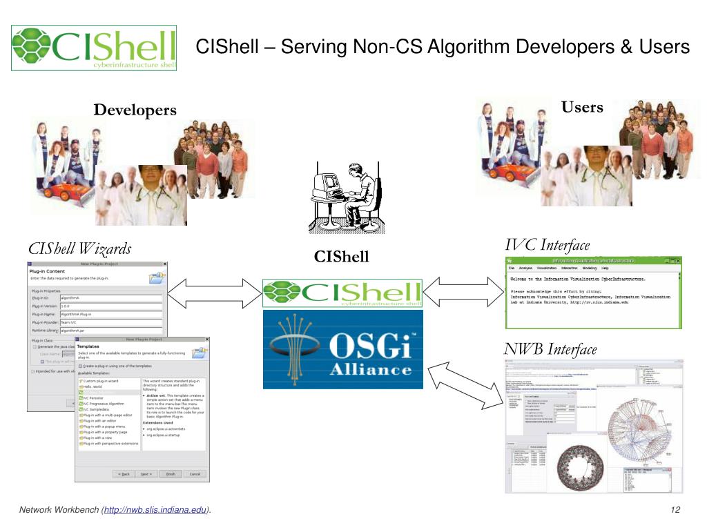 CIShell – Serving Non-CS Algorithm Developers & Users Users Developers IVC Interface CIShell Wizards CIShell NWB Interface Network Workbench (http://nwb.slis.indiana.edu). 12