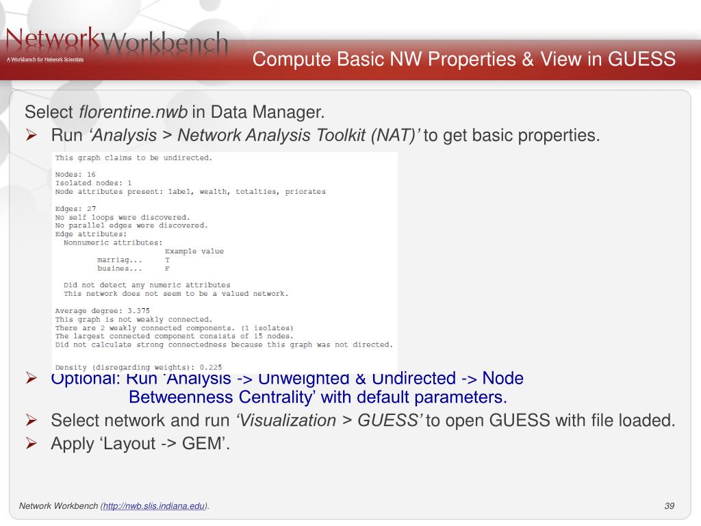NWB Tool Overview • Download, install, and run. • Load, view, convert, save data. • Read and visualize a directory hierarchy. • Load a network, compute its basic properties, and explore it in GUESS. Network Workbench (http://nwb.slis.indiana.edu). 38
