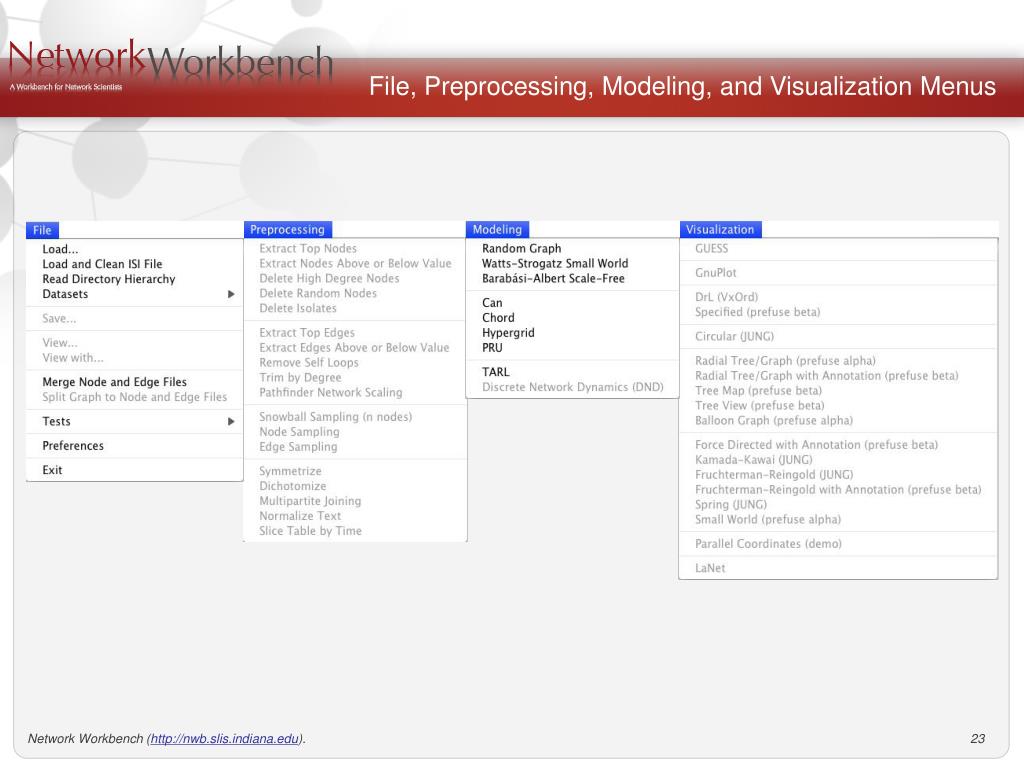File, Preprocessing, Modeling, and Visualization Menus Network Workbench (http://nwb.slis.indiana.edu). 23