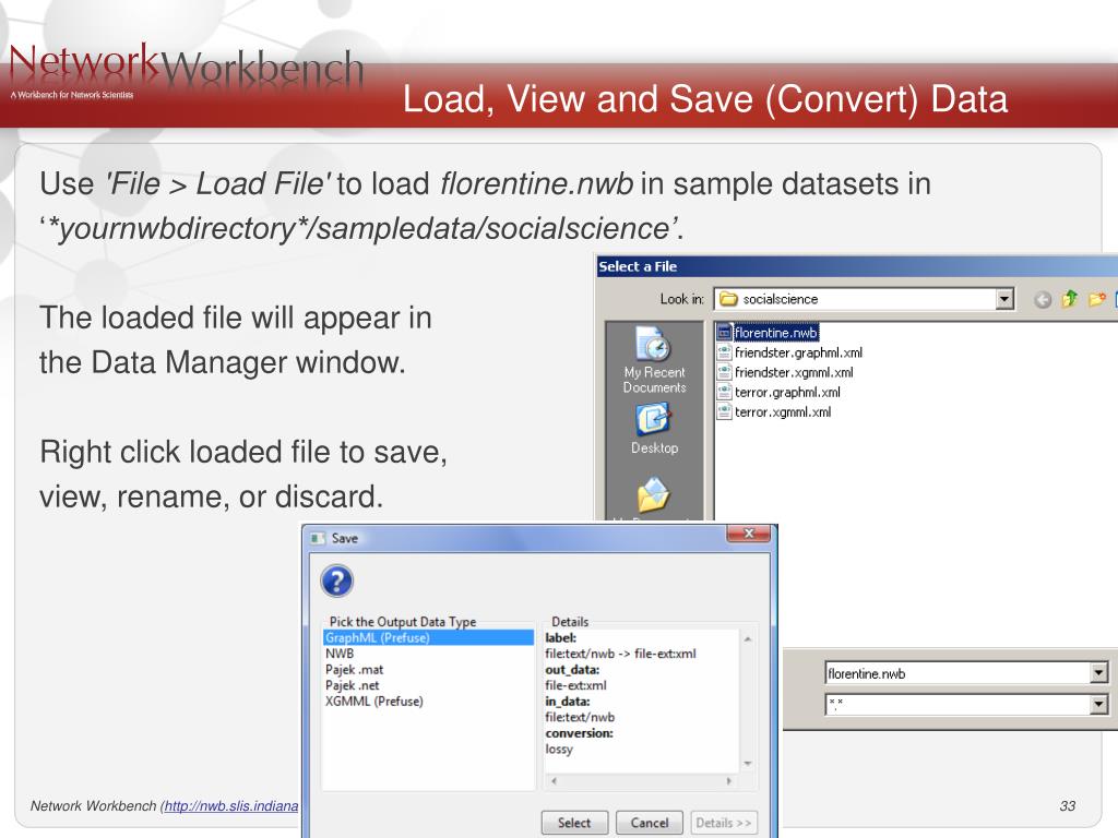 Load, View and Save (Convert) Data Use 'File > Load File' to load florentine.nwb in sample datasets in ‘*yournwbdirectory*/sampledata/socialscience’. The loaded file will appear in the Data Manager window. Right click loaded file to save, view, rename, or discard. Network Workbench (http://nwb.slis.indiana.edu). 33