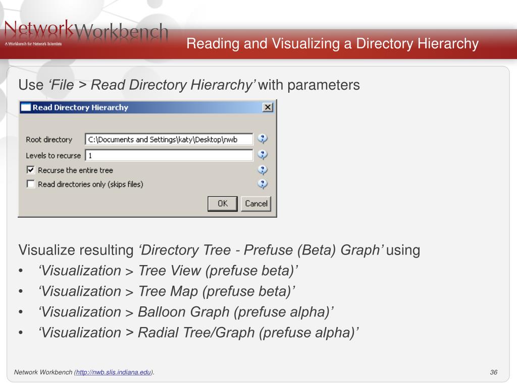 NWB Tool Overview • Download, install, and run. • Load, view, convert, save data. • Read and visualize a directory hierarchy. • Load a network, compute its basic properties, and explore it in GUESS. Network Workbench (http://nwb.slis.indiana.edu). 35