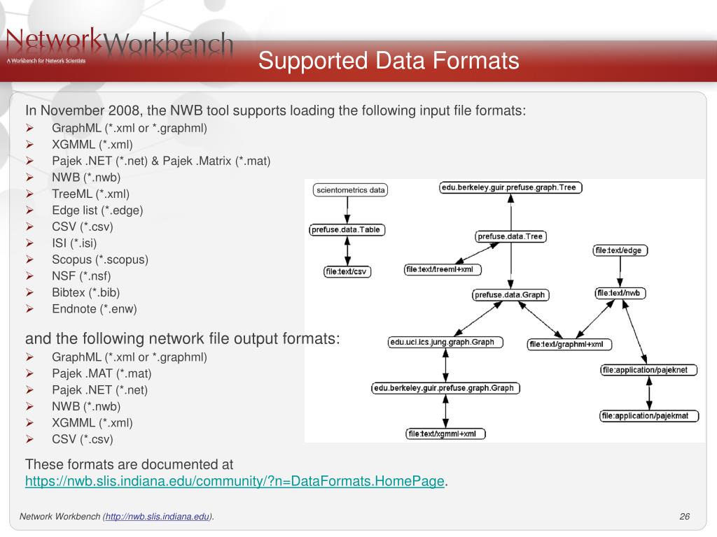 Integrated Tools Gnuplot portable command-line driven interactive data and function plotting utility http://www.gnuplot.info/. GUESS exploratory data analysis and visualization tool for graphs and networks. https://nwb.slis.indiana.edu/community/?n=VisualizeData.GUESS. Network Workbench (http://nwb.slis.indiana.edu). 25
