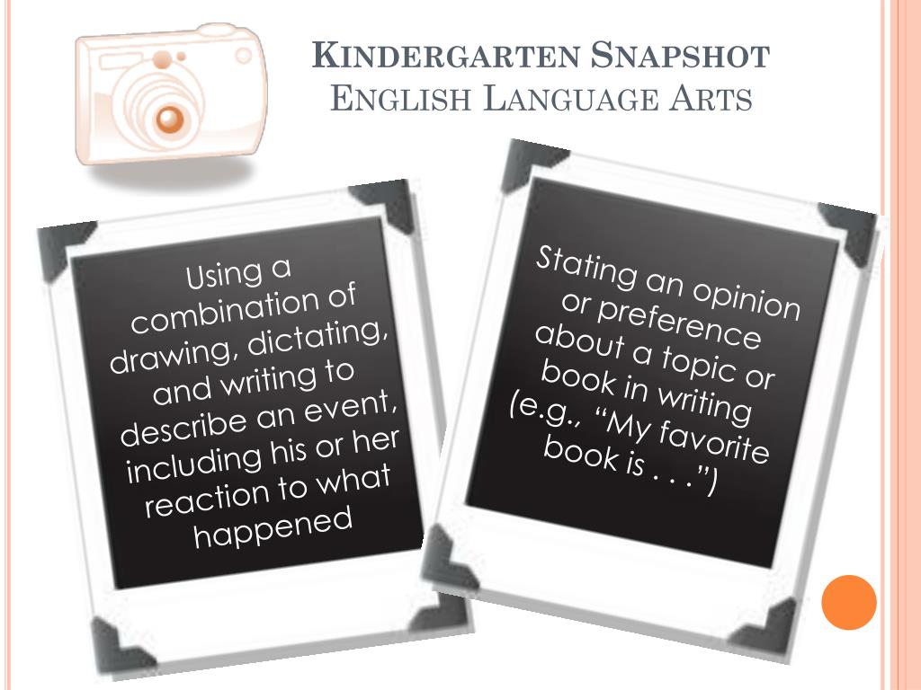 KindergartenSnapshotEnglish Language Arts Using a combination of drawing, dictating, and writing to describe an event, including his or her reaction to what happened Stating an opinion or preference about a topic or book in writing (e.g., “My favorite book is . . .”)