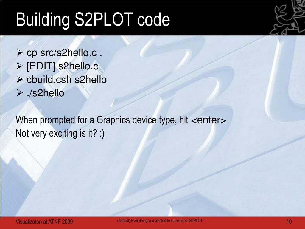 Building S2PLOT code • cp src/s2hello.c . • [EDIT] s2hello.c • cbuild.csh s2hello • ./s2hello When prompted for a Graphics device type, hit <enter> Not very exciting is it? :)